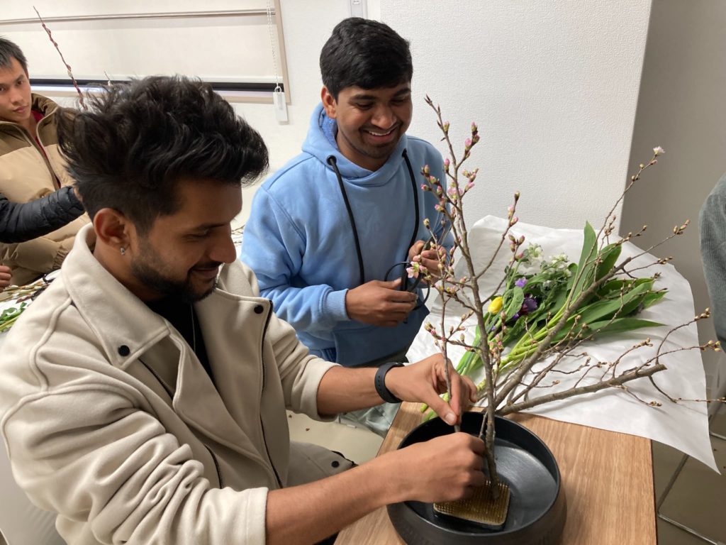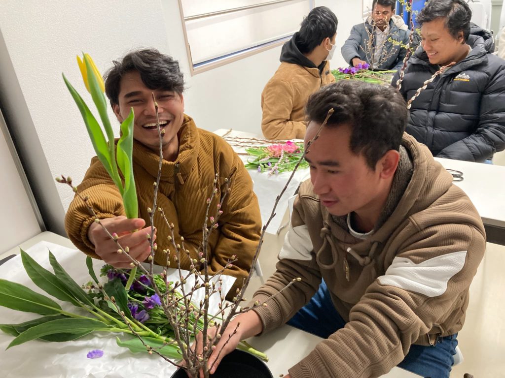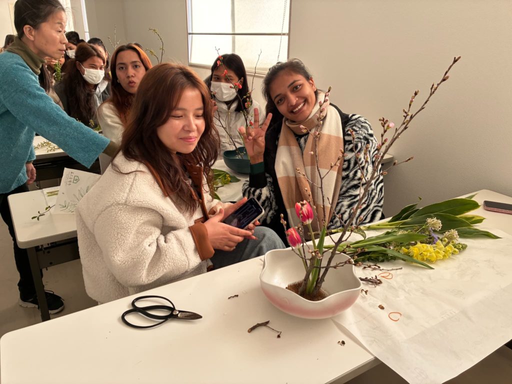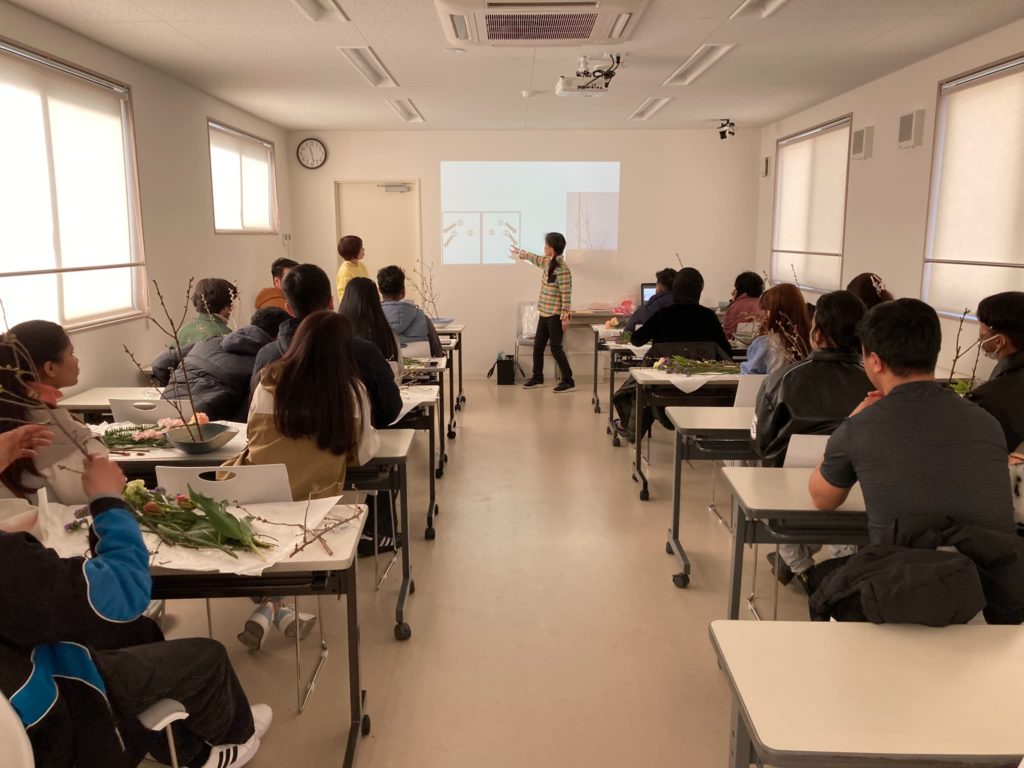 先生の指導の下、丁寧に生け花を楽しんでいました。