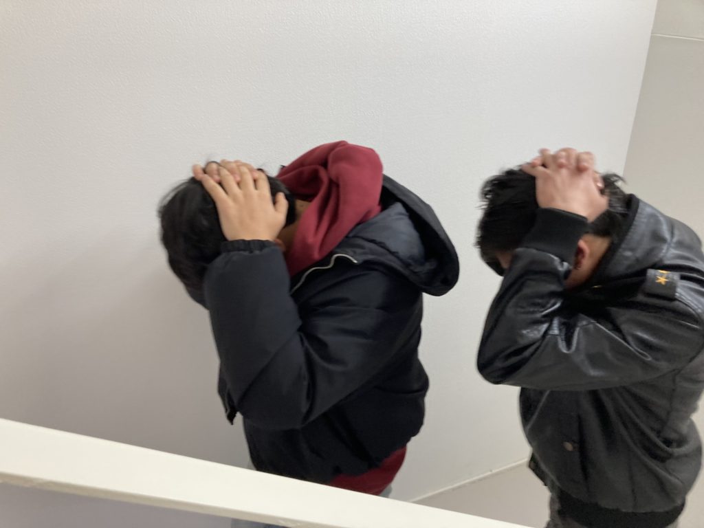 体の大きい学生にとって、机の下はかなりきつそうでしたが、何とか頭は守れそうです。
