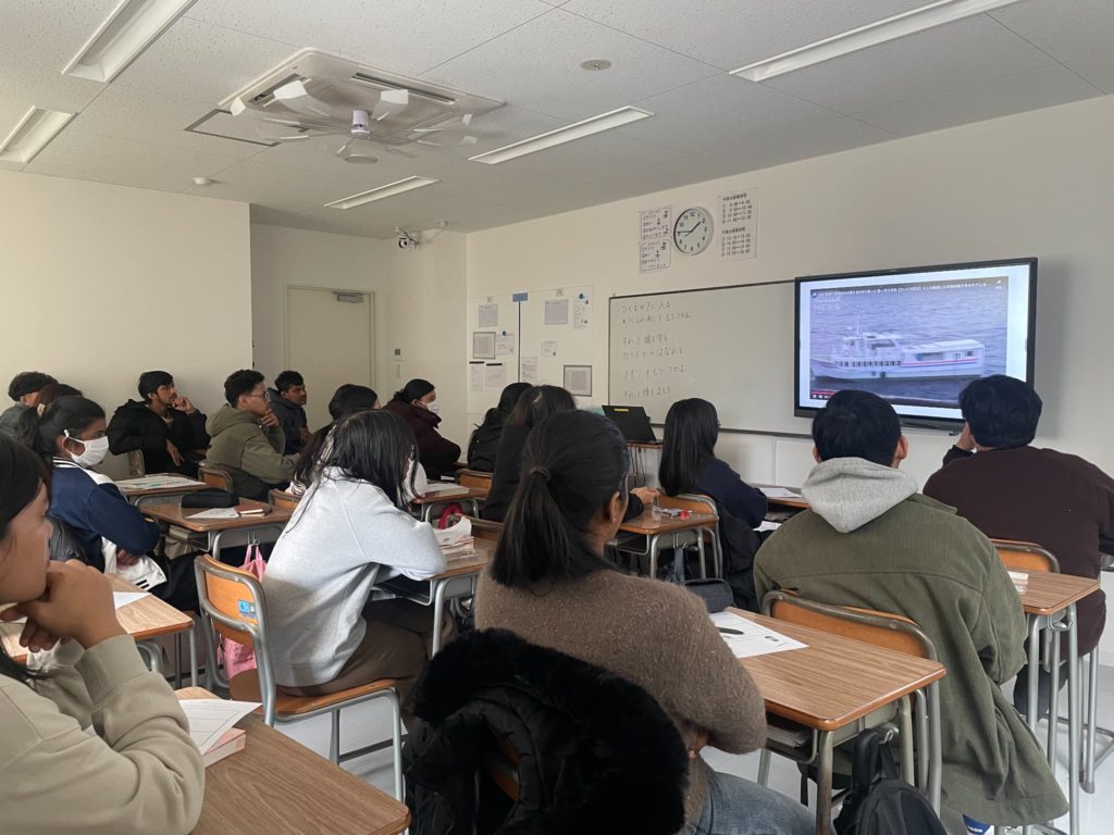 まずはビデオで日本の震災の多さを知ってもらい、地震への備えや取るべき行動を学びました。